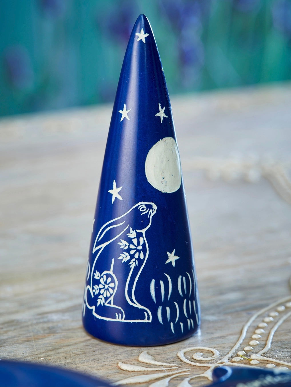 A blue hare moon ring holder, hand carved in cone shaped soapstone with white imagery.