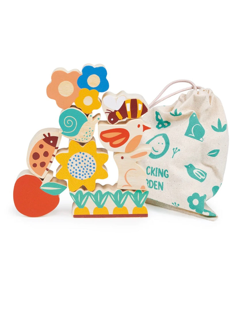 Our Happy Stacking Garden includes a row of carrots, a sunflower, flowers, a bee, a ladybird, a snail, an apple, a bird, and a rabbit, nicely packed in an illustrated drawstring bag.