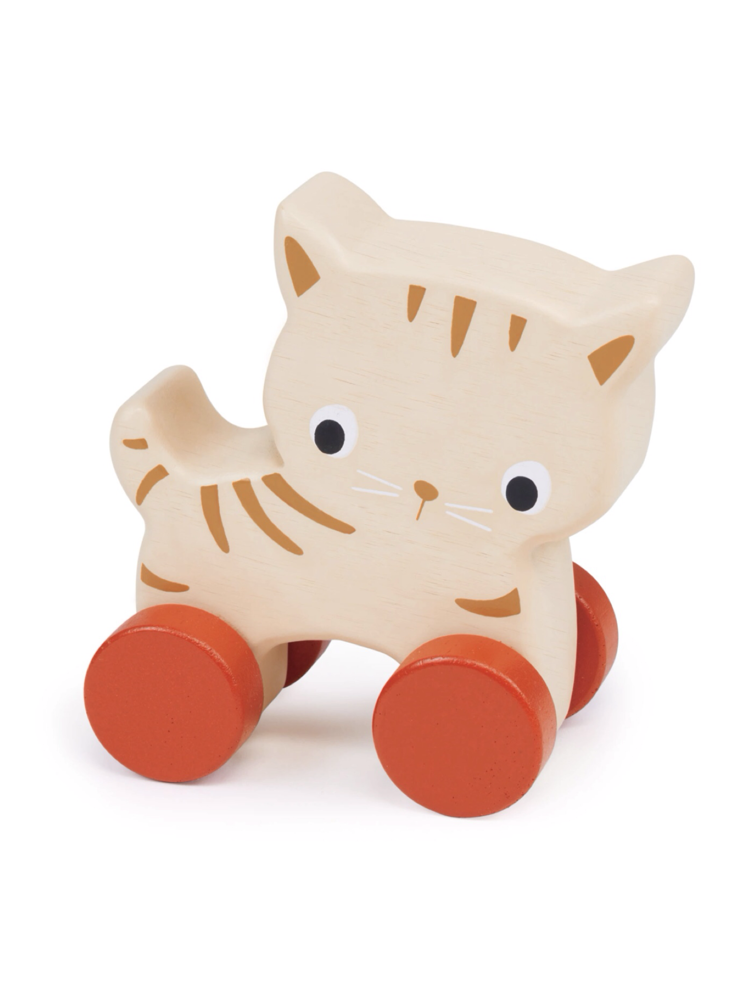 Wooden hand held kitten toy with 4 wheels