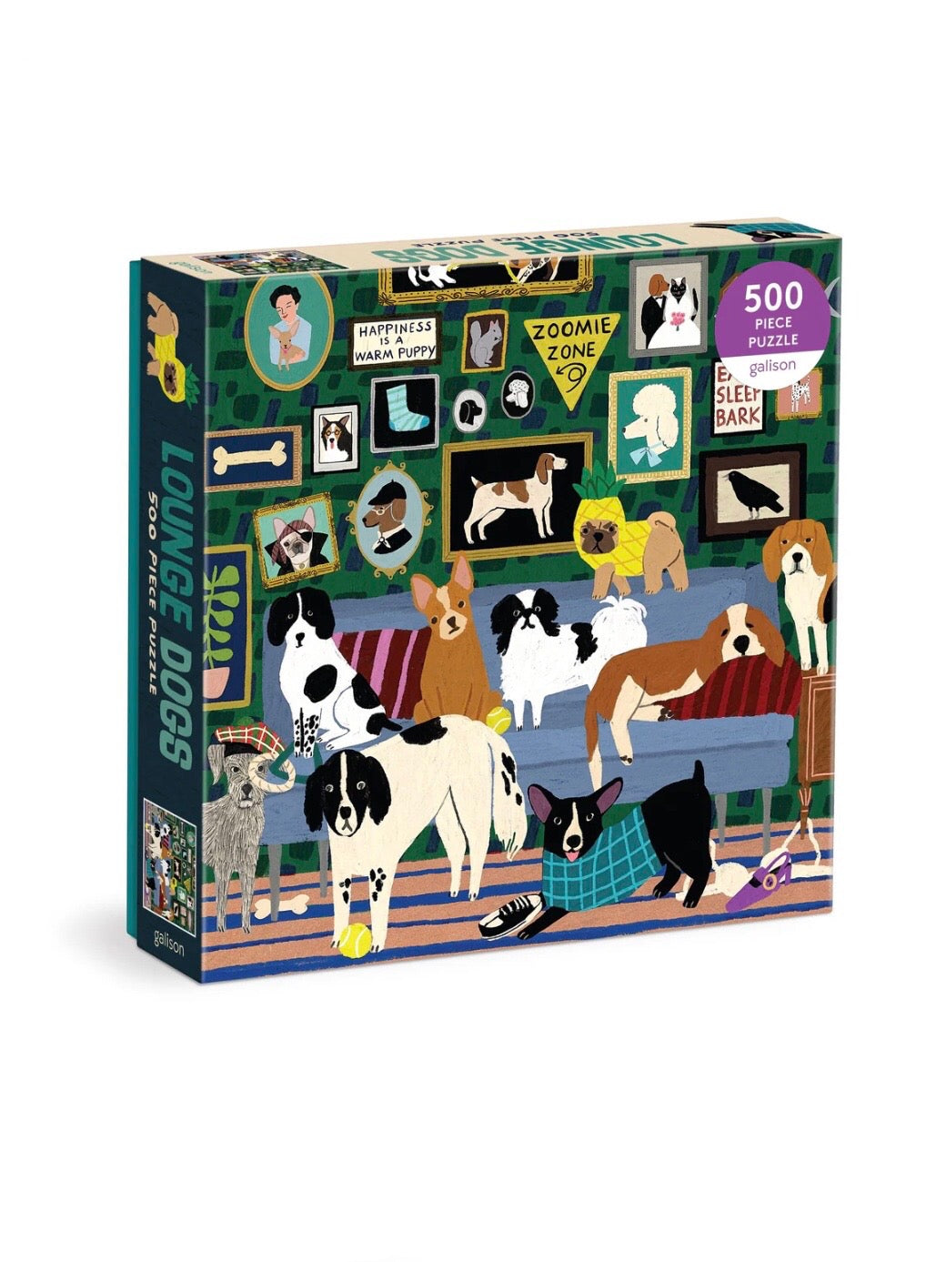 The Lounge Dogs 500 Piece Puzzle is a comical puzzle featuring a vignette of dogs transforming a living room into a dog lounge. This puzzle is fun for the whole family. Puzzles are packaged in matte-finish sturdy boxes, perfect for gifting, reuse, and storage.