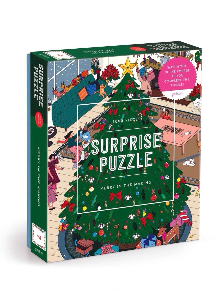 The Merry In The Making 1000 Piece Surprise Puzzle from Galison is the perfect amount of exciting and challenging for hours of puzzling fun. The box includes an insert with the puzzle image except for the center portion which is designed to be a surprise and completed with no visual reference.