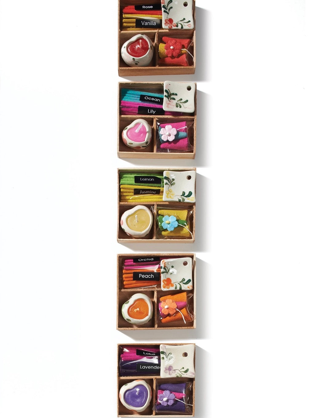Incense gift box set with heart-shaped ceramic candle and burner in a lovely wooden box.