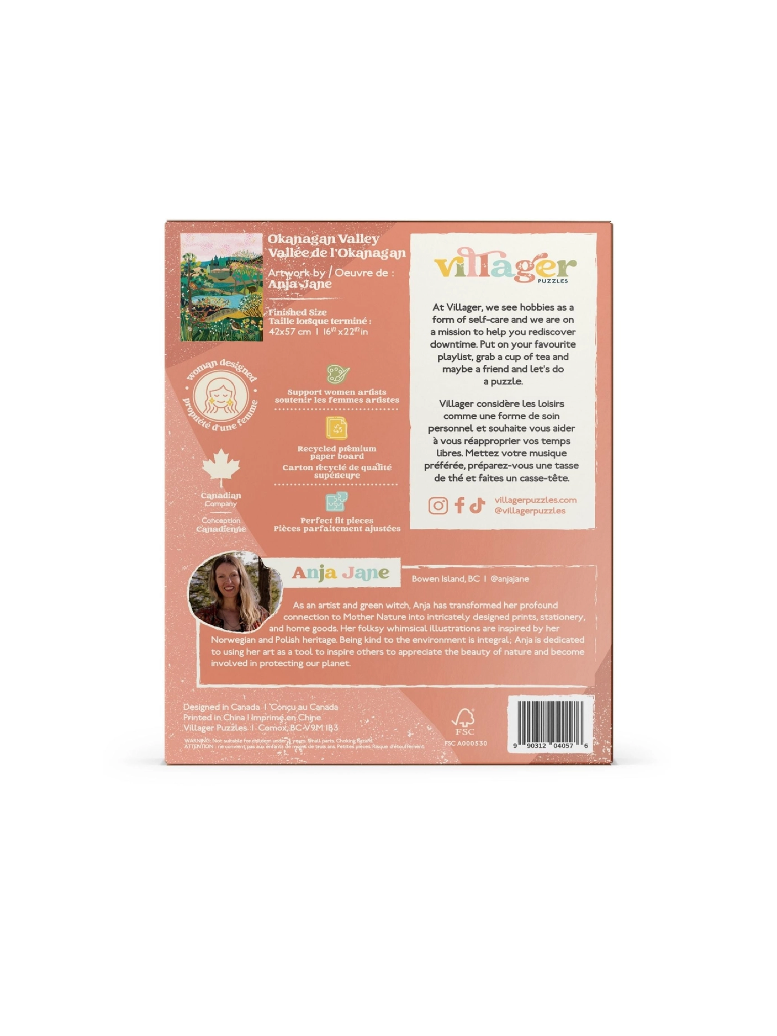 Explore the beauty of the Okanagan Valley with this stunning puzzle, filled with charming details to discover. Spot a historic railroad trestle, wandering quail, lush orchards, and native plants as you piece together this picturesque landscape. Beautifully illustrated by Bowen Island artist, Anja Jane.