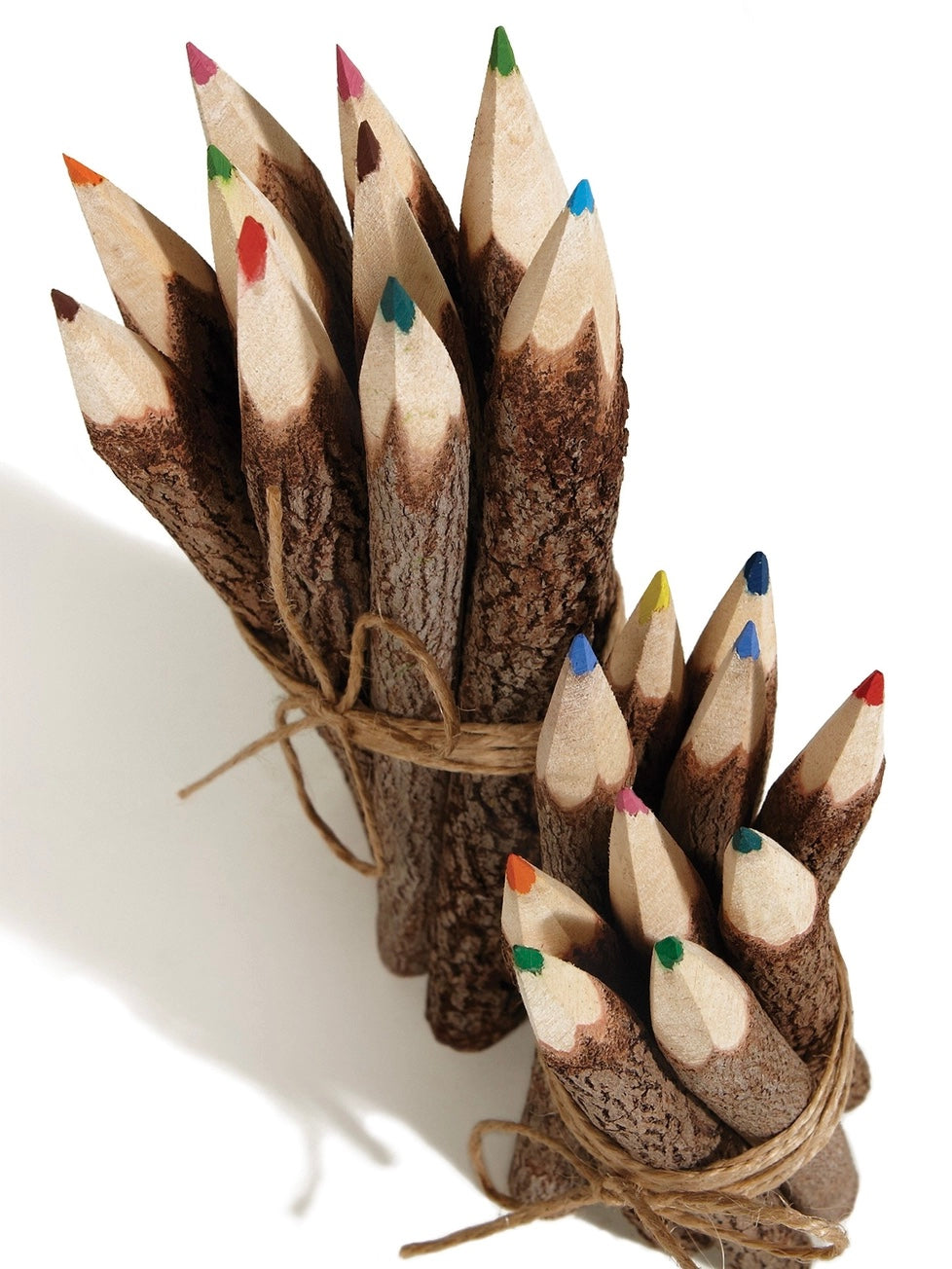 Set of 10 rustic wooden assorted colored pencils. Twig pencils are crafted from the natural tree branches of the Tamarind tree which is very common and prolific throughout SE Asia. The trees are farmed for their fruit and after the fruit is harvested, the branches are cut and left to dry in the sun. They are then drilled and the pencil colour is inserted. 14cm.