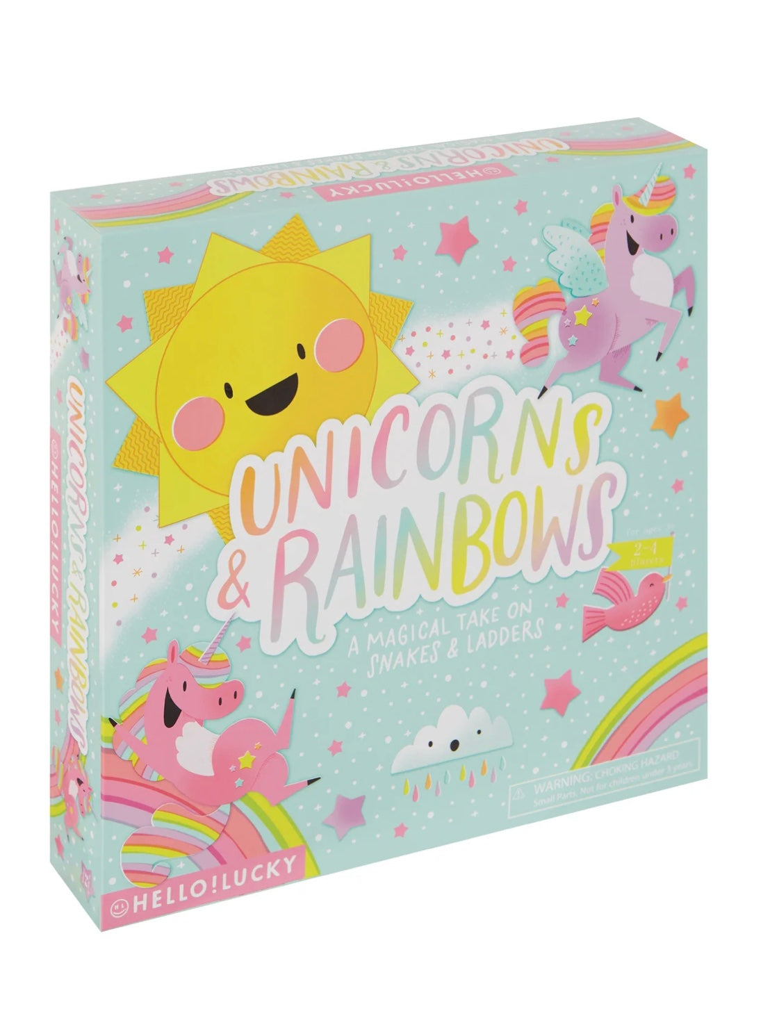 In this magical take on Snakes and Ladders, players are invited to fly to the sky as winged unicorns and slide down rainbows! Players take turns spinning the spinning the sun and counting up and down the board with the goal of being the first to reach 100! A simple, fun game for kids who are learning numbers. No reading required.