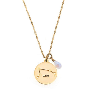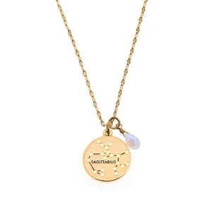 Show off your astrological sign with this celestial necklace featuring a star map pendant paired with an iridescent moonstone charm. Available in gold and silver.